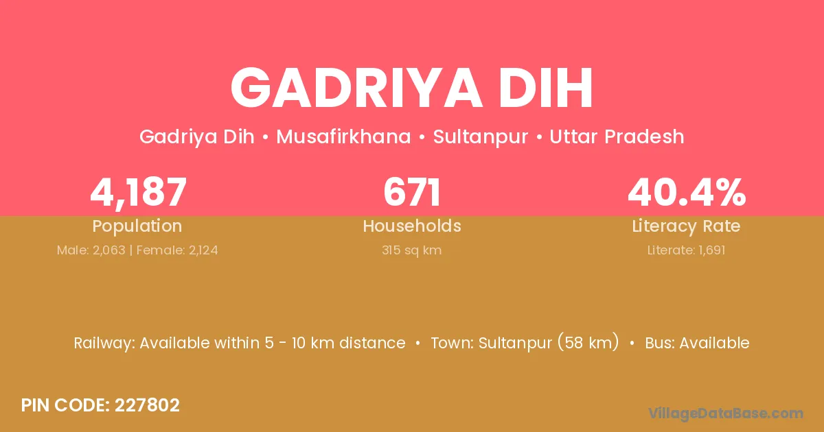 Sultanpur (58 km) is the nearest town to Gadriya Dih village for major economic activities and is located approximately 58 km away.