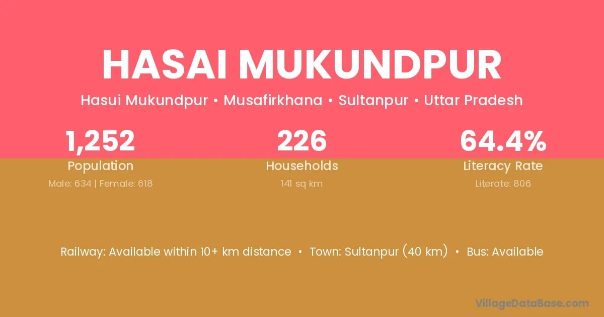 Sultanpur (40 km) is the nearest town to Hasai Mukundpur village for major economic activities and is located approximately 40 km away.