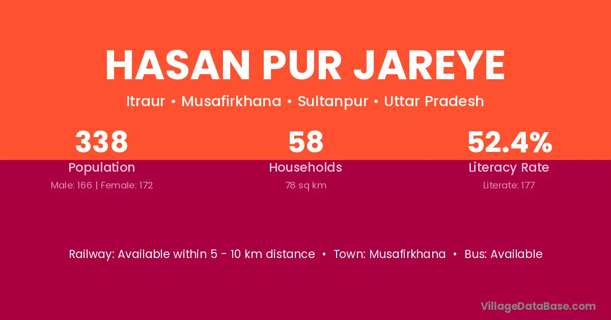 Hasan Pur Jareye village has a total population of 338 people, of which 166 are males and 172 are females.