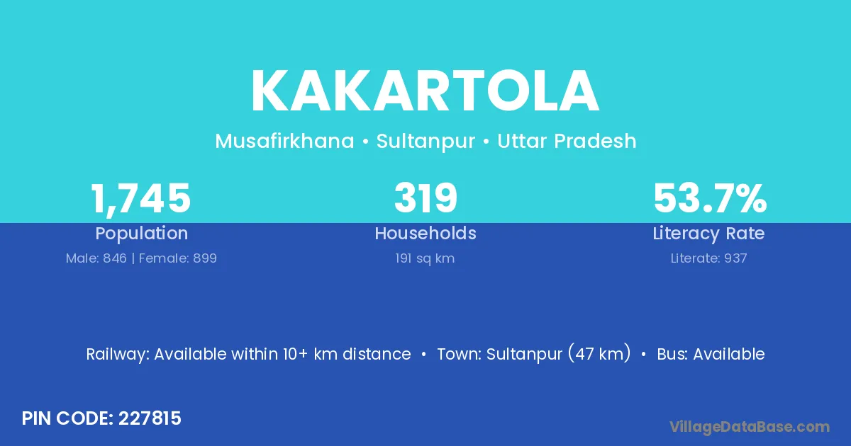 Sultanpur (47 km) is the nearest town to Kakartola village for major economic activities and is located approximately 47 km away.