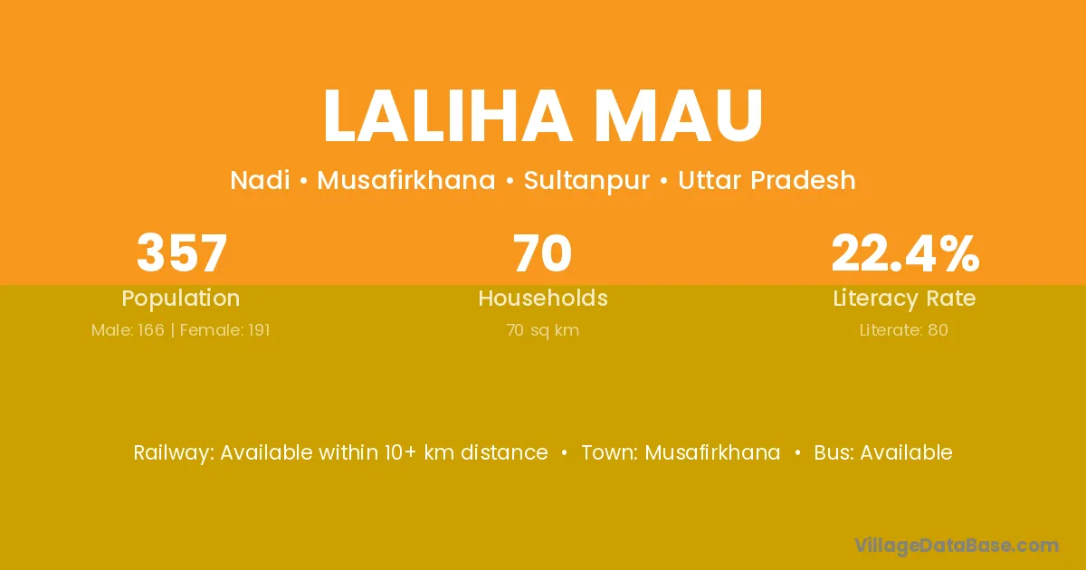 The literacy rate of Laliha Mau village is 22.41%. Male literacy stands at 40.36% and female literacy at 6.81%.