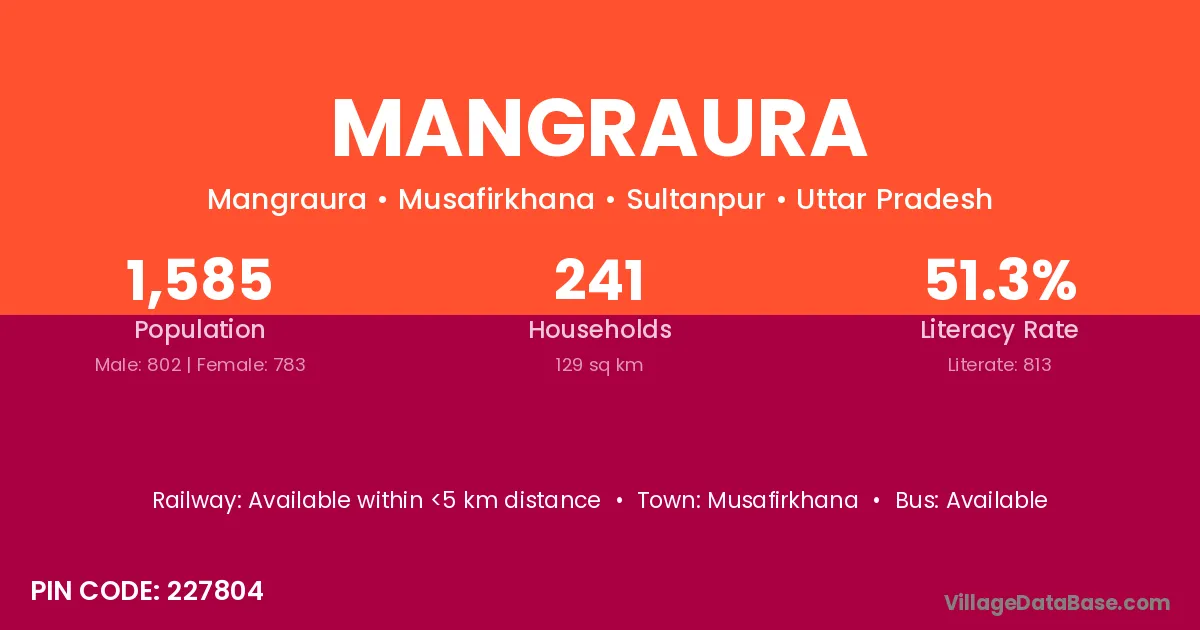 Mangraura village has a total population of 1,585 people, of which 802 are males and 783 are females.