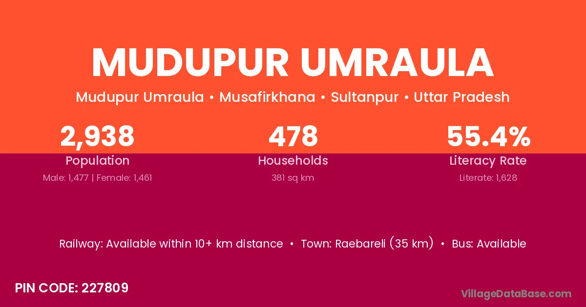 Raebareli (35 km) is the nearest town to Mudupur Umraula village for major economic activities and is located approximately 35 km away.