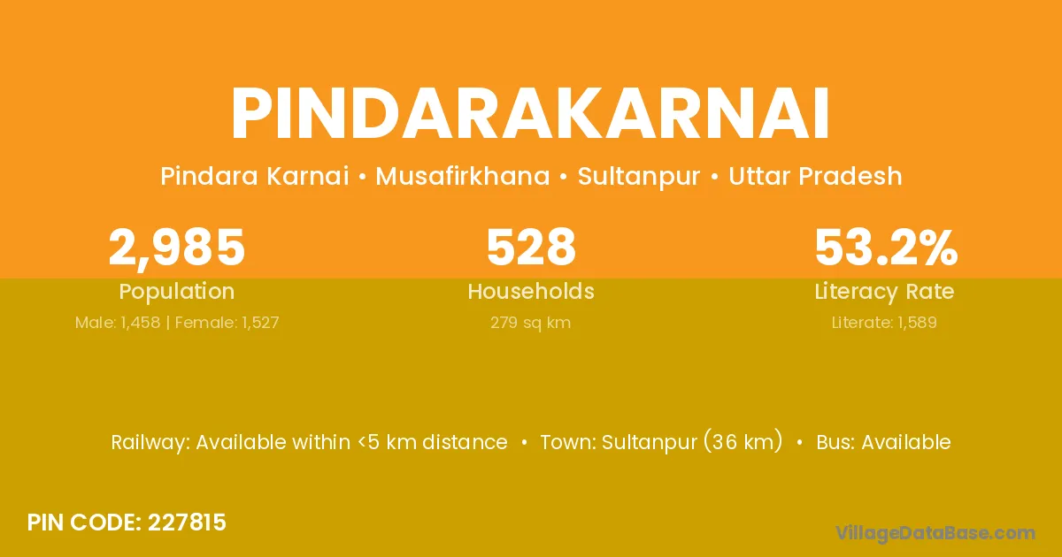 Sultanpur (36 km) is the nearest town to Pindarakarnai village for major economic activities and is located approximately 36 km away.