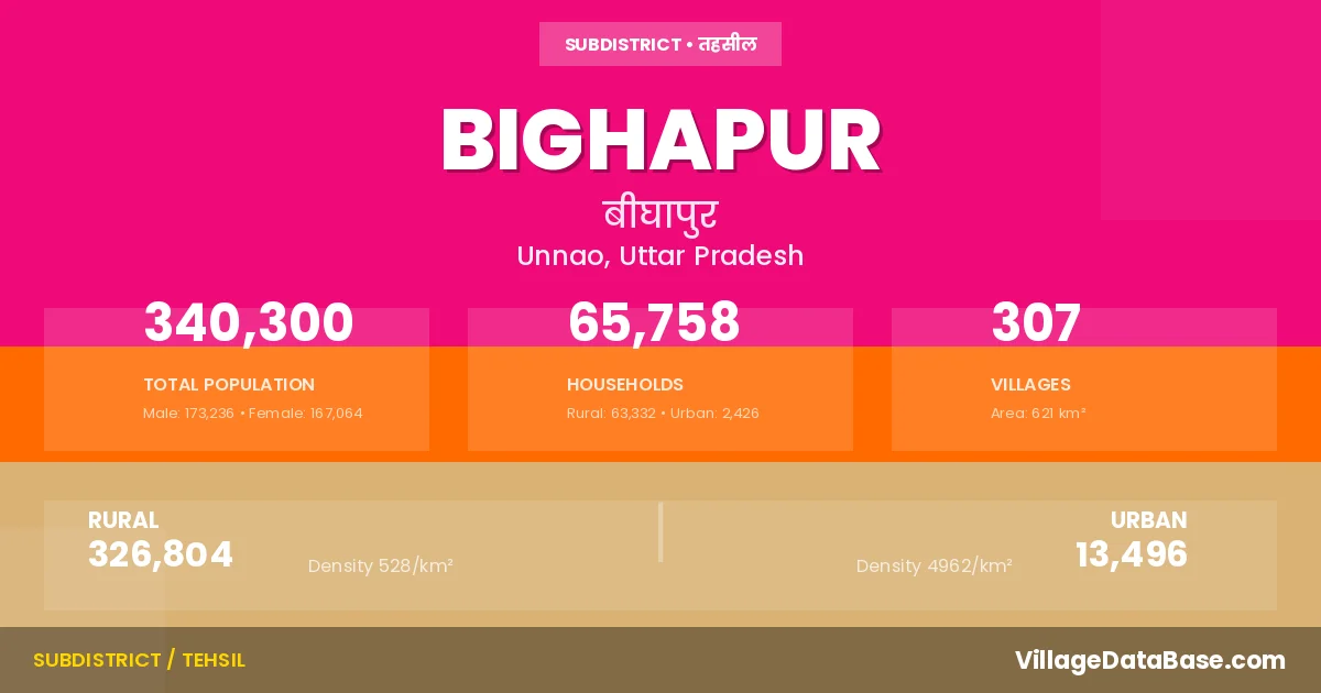 According to the 2011 census The total area of Bighapur Tehsil is 621 km², with a population of 340300 people. The population density is 548 inhabitants per square kilometre, and there are approximately 65758 houses in the sub district.
