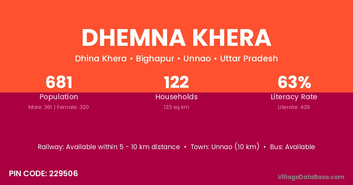 Unnao (10 km) is the nearest town to Dhemna Khera village for major economic activities and is located approximately 10 km away.