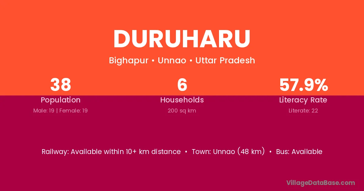 Unnao (48 km) is the nearest town to Duruharu village for major economic activities and is located approximately 48 km away.