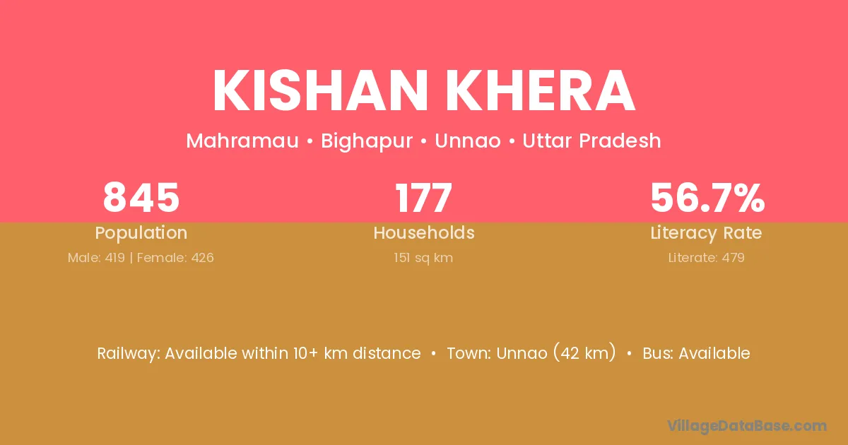 Unnao (42 km) is the nearest town to Kishan Khera village for major economic activities and is located approximately 42 km away.
