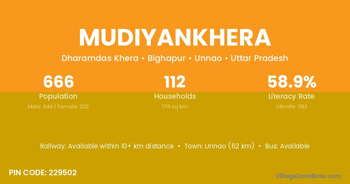 Unnao (62 km) is the nearest town to Mudiyankhera village for major economic activities and is located approximately 62 km away.