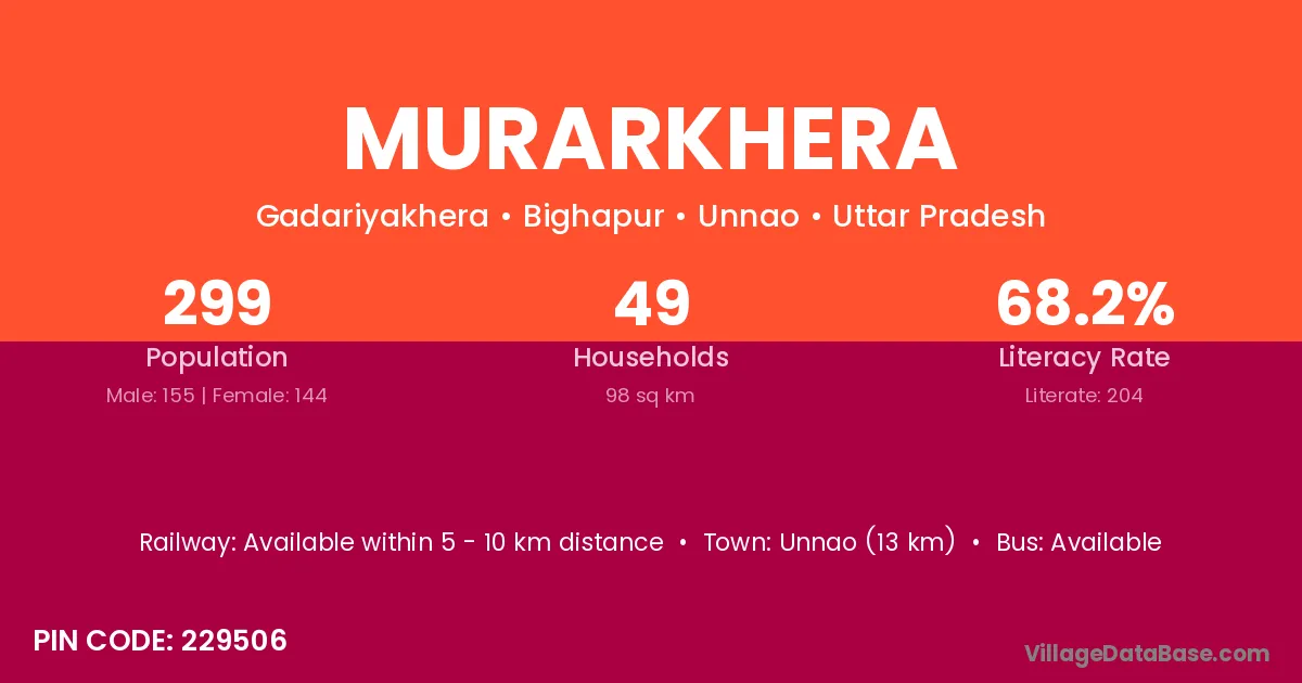 Unnao (13 km) is the nearest town to Murarkhera village for major economic activities and is located approximately 13 km away.