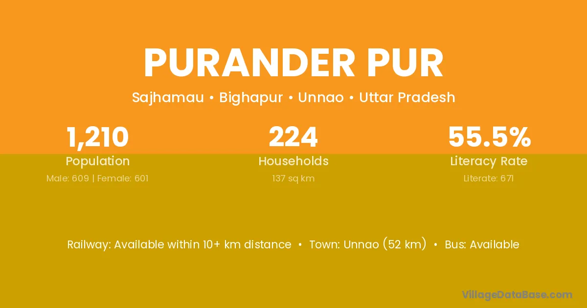 Unnao (52 km) is the nearest town to Purander Pur village for major economic activities and is located approximately 52 km away.