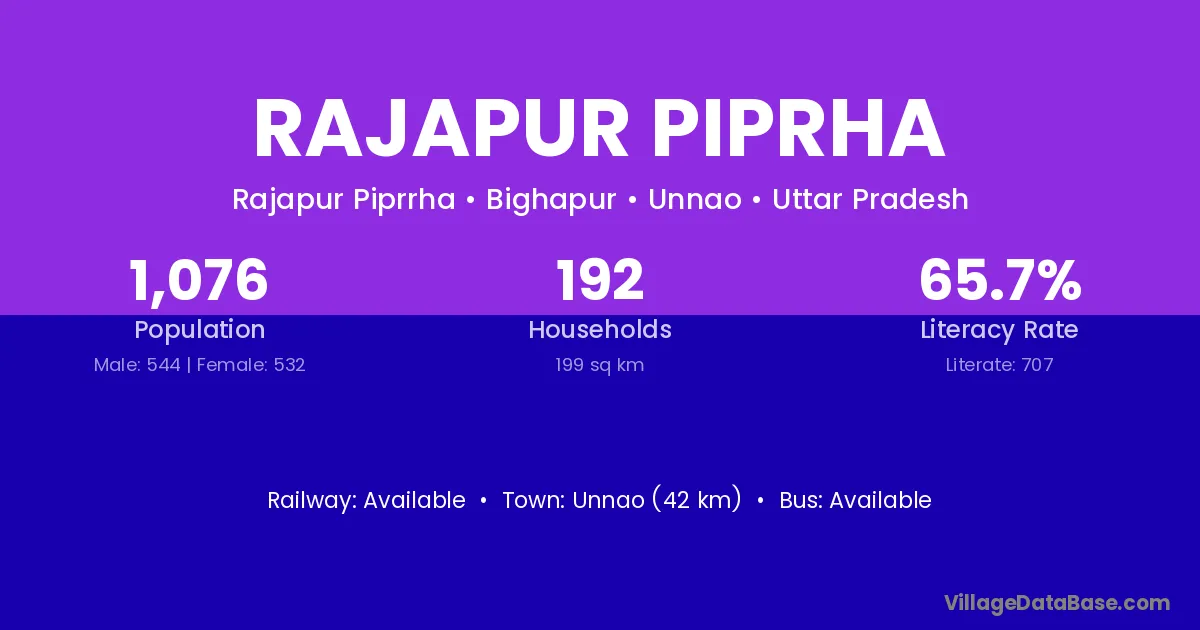 Unnao (42 km) is the nearest town to Rajapur Piprha village for major economic activities and is located approximately 42 km away.
