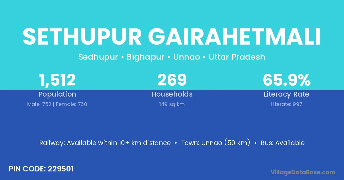 Unnao (50 km) is the nearest town to Sethupur Gairahetmali village for major economic activities and is located approximately 50 km away.