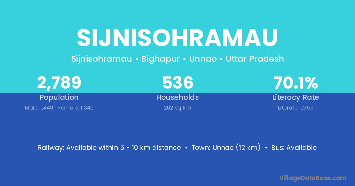 Unnao (12 km) is the nearest town to Sijnisohramau village for major economic activities and is located approximately 12 km away.