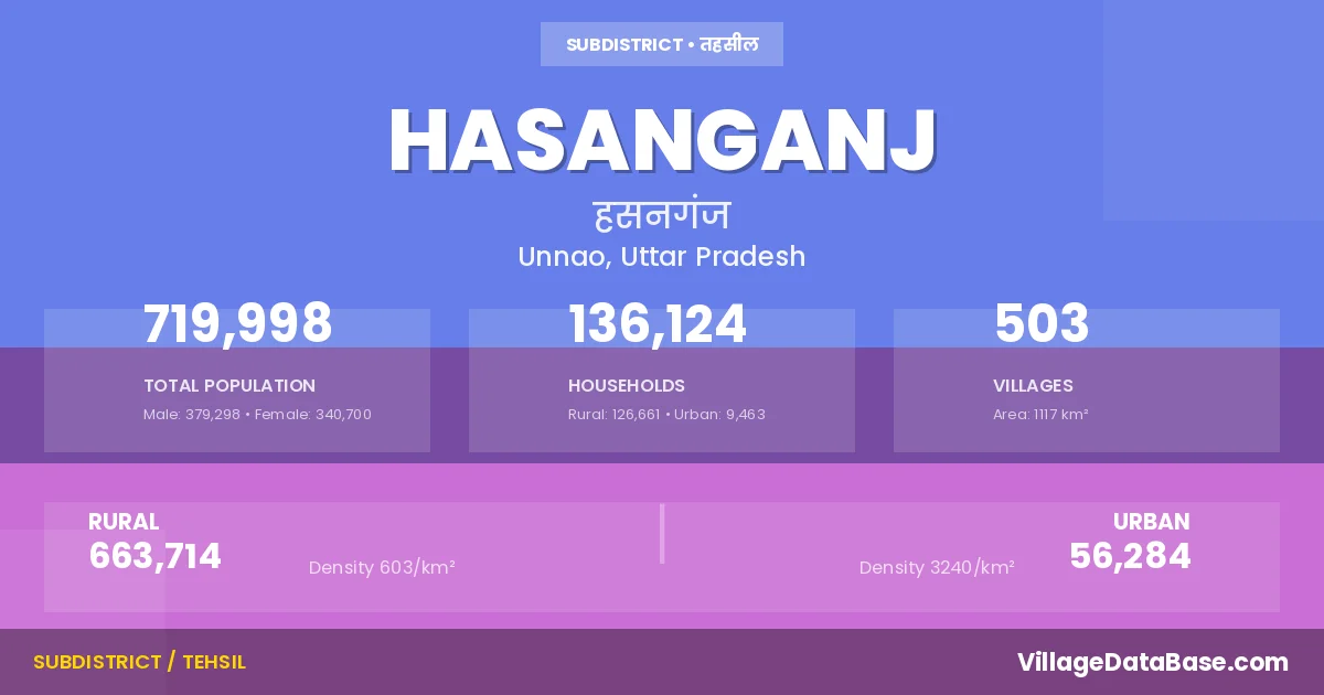 According to the 2011 census The total area of Hasanganj Tehsil is 1117 km², with a population of 719998 people. The population density is 644 inhabitants per square kilometre, and there are approximately 136124 houses in the sub district.