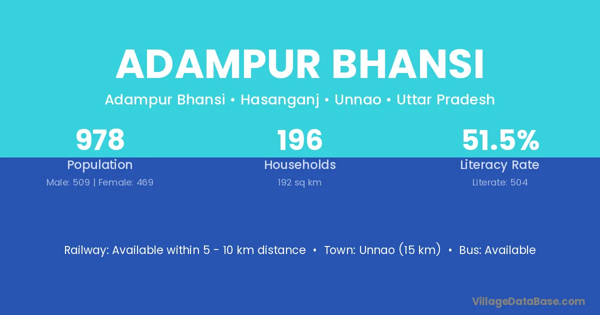 Unnao (15 km) is the nearest town to Adampur Bhansi village for major economic activities and is located approximately 15 km away.
