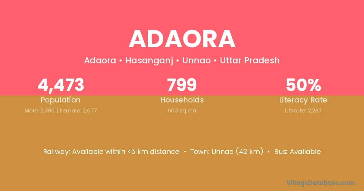 Unnao (42 km) is the nearest town to Adaora village for major economic activities and is located approximately 42 km away.