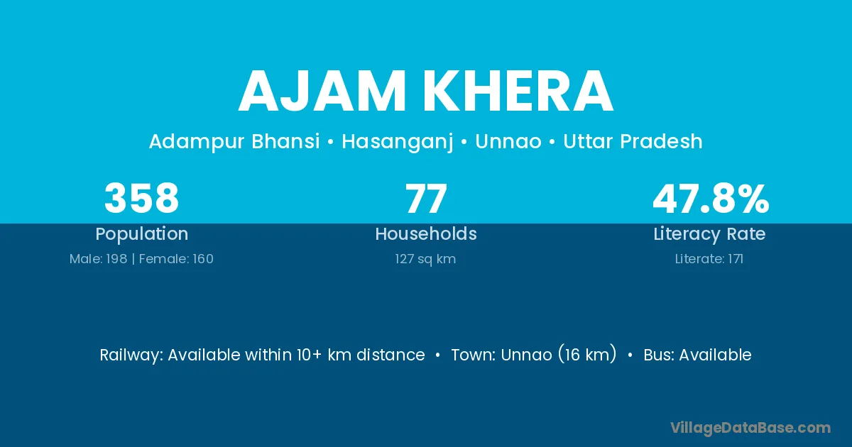 Unnao (16 km) is the nearest town to Ajam Khera village for major economic activities and is located approximately 16 km away.