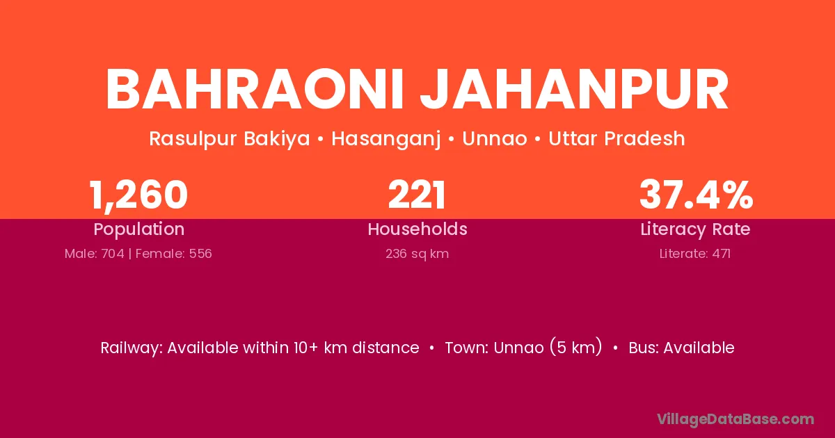 Unnao (5 km) is the nearest town to Bahraoni Jahanpur village for major economic activities and is located approximately 5 km away.