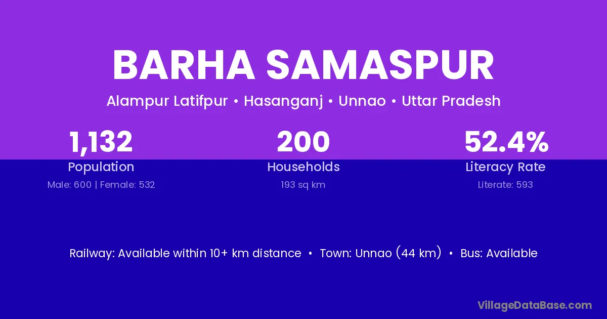 Unnao (44 km) is the nearest town to Barha Samaspur village for major economic activities and is located approximately 44 km away.