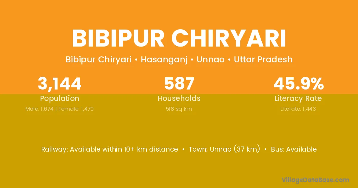 Unnao (37 km) is the nearest town to Bibipur Chiryari village for major economic activities and is located approximately 37 km away.
