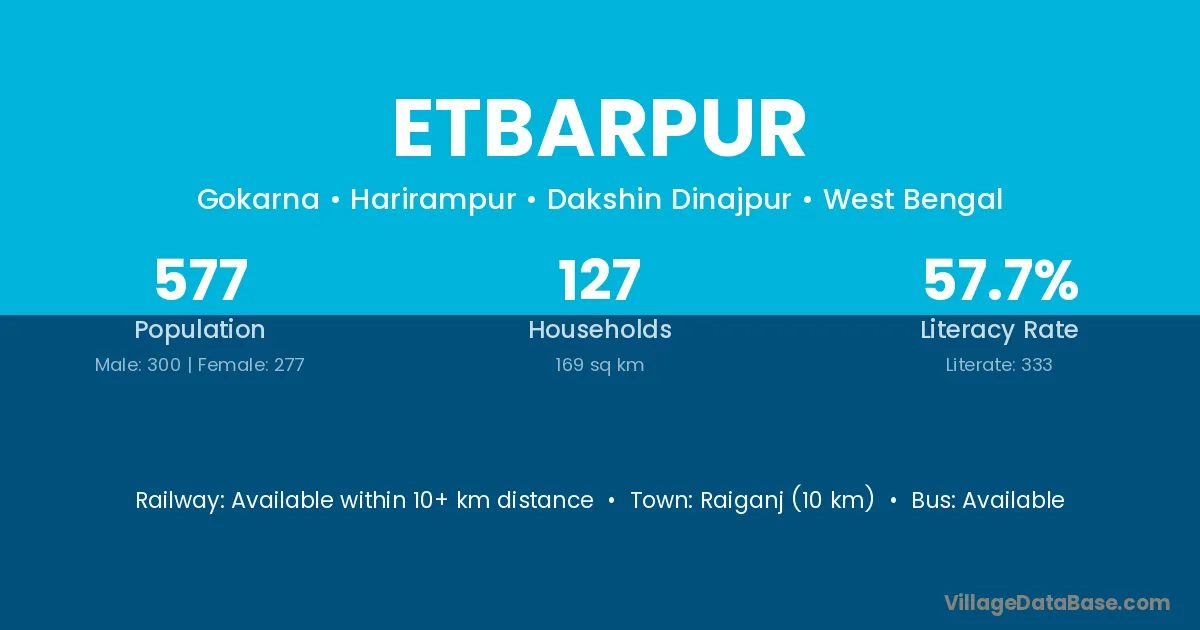 The literacy rate of Etbarpur village is 67.95%. Male literacy stands at 77.64% and female literacy at 57.17%.