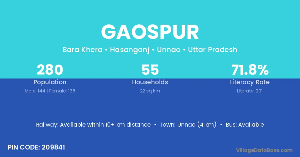 Unnao (4 km) is the nearest town to Gaospur village for major economic activities and is located approximately 4 km away.