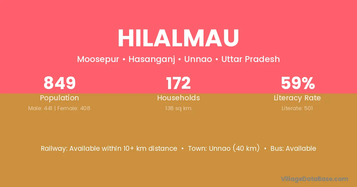 Unnao (40 km) is the nearest town to Hilalmau village for major economic activities and is located approximately 40 km away.