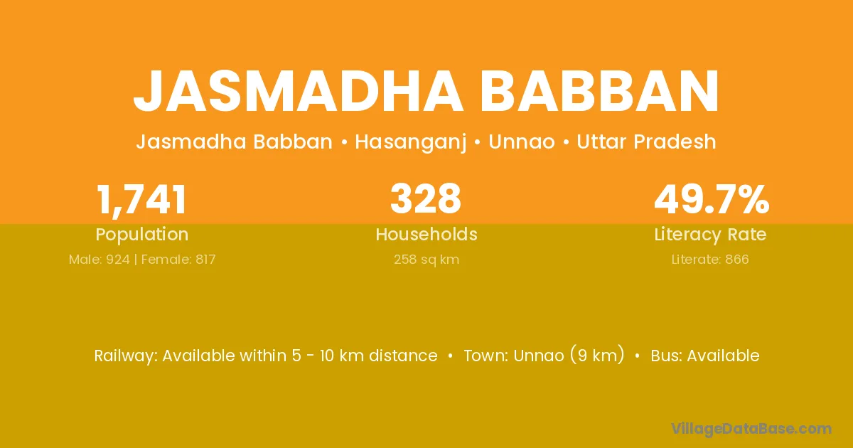 Unnao (9 km) is the nearest town to Jasmadha Babban village for major economic activities and is located approximately 9 km away.