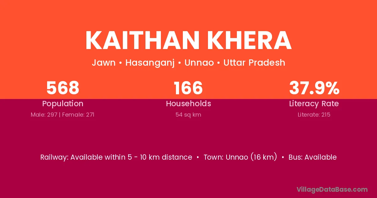 Unnao (16 km) is the nearest town to Kaithan Khera village for major economic activities and is located approximately 16 km away.