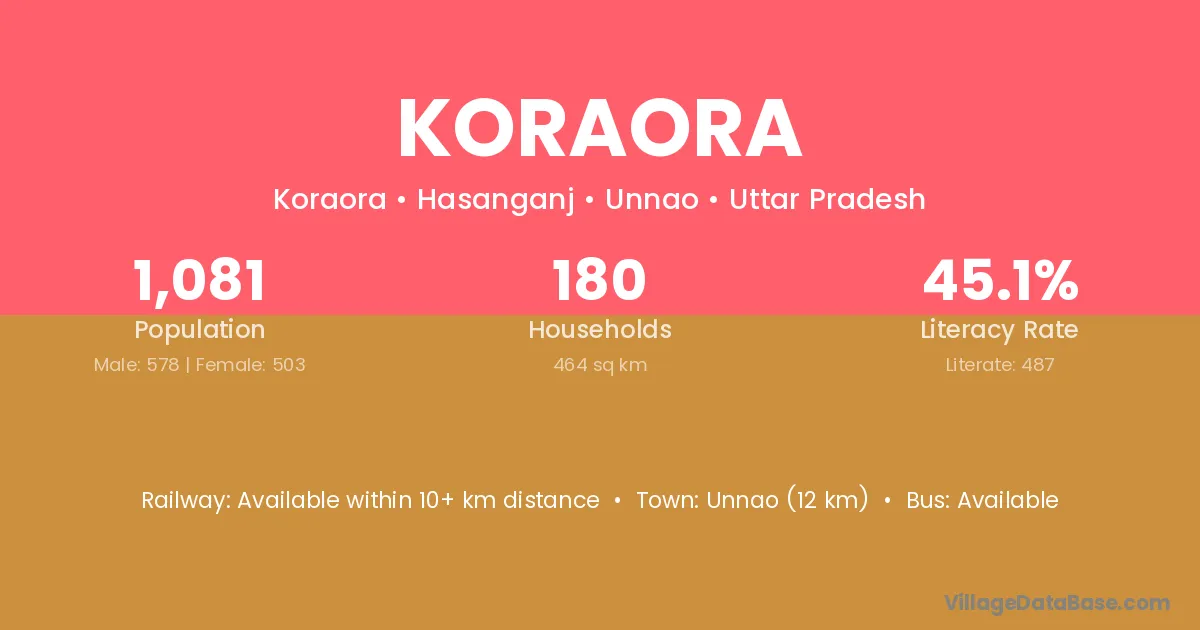 Unnao (12 km) is the nearest town to Koraora village for major economic activities and is located approximately 12 km away.