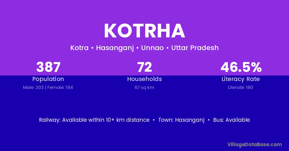 Kotrha village has a total population of 387 people, of which 203 are males and 184 are females.