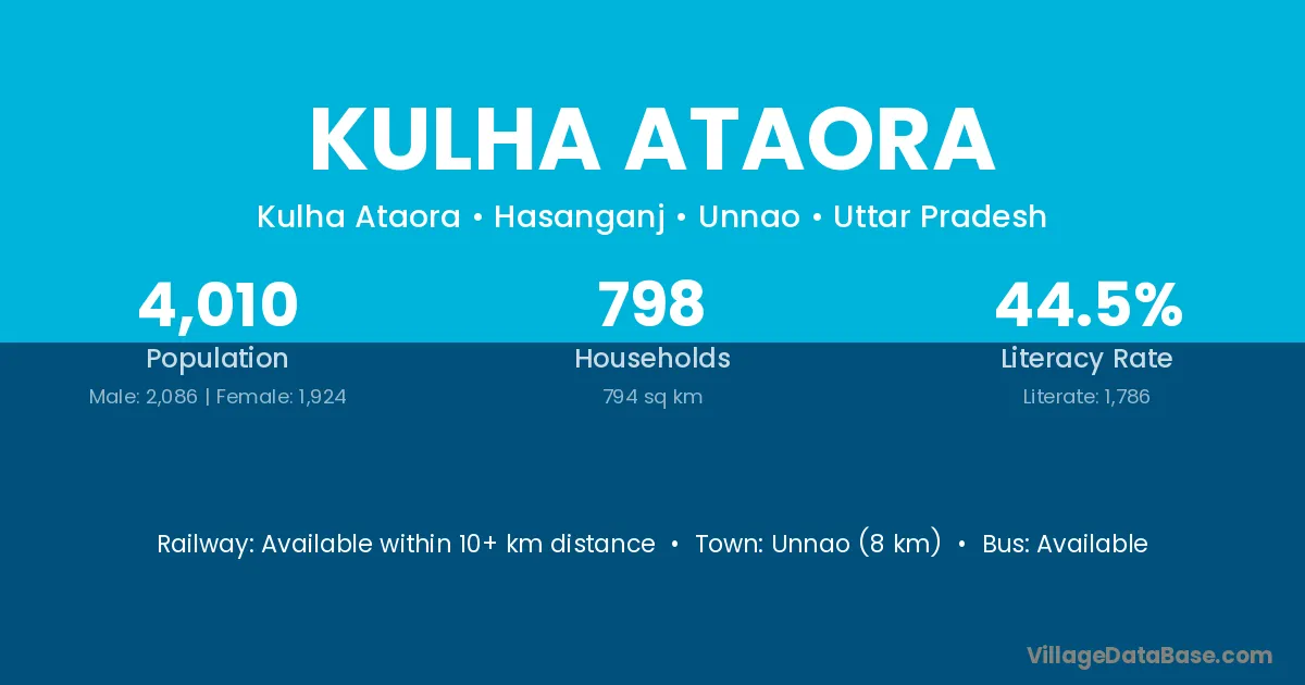 Unnao (8 km) is the nearest town to Kulha Ataora village for major economic activities and is located approximately 8 km away.