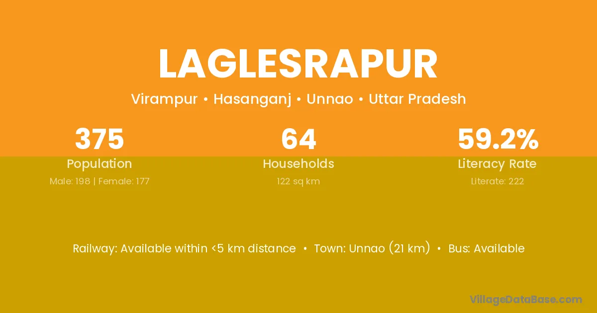 Unnao (21 km) is the nearest town to Laglesrapur village for major economic activities and is located approximately 21 km away.