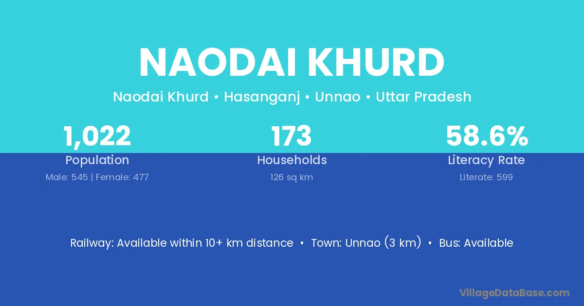 Unnao (3 km) is the nearest town to Naodai Khurd village for major economic activities and is located approximately 3 km away.