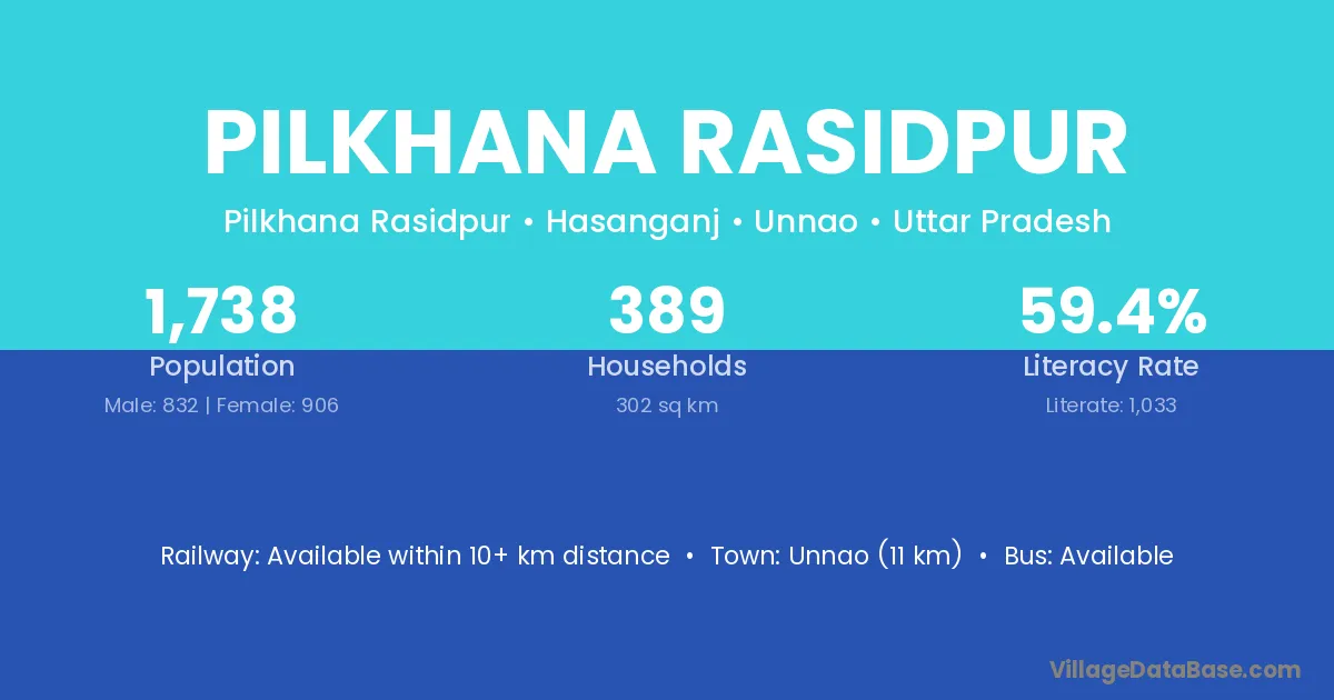 Pilkhana Rasidpur village has a total population of 1,738 people, of which 832 are males and 906 are females.