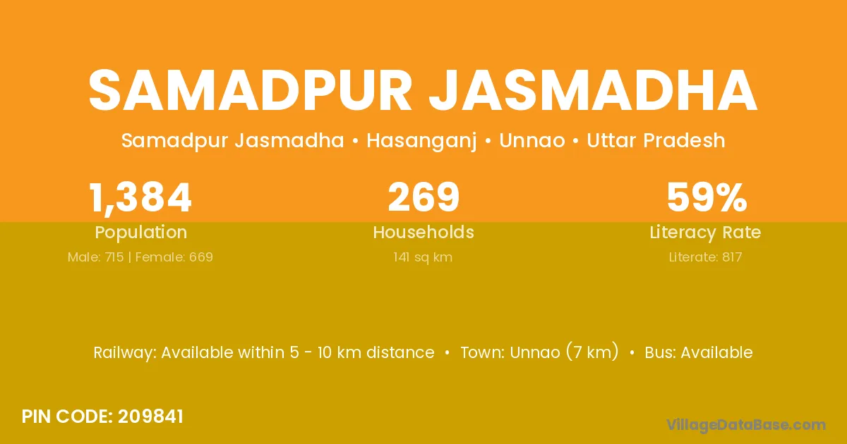 Unnao (7 km) is the nearest town to Samadpur Jasmadha village for major economic activities and is located approximately 7 km away.