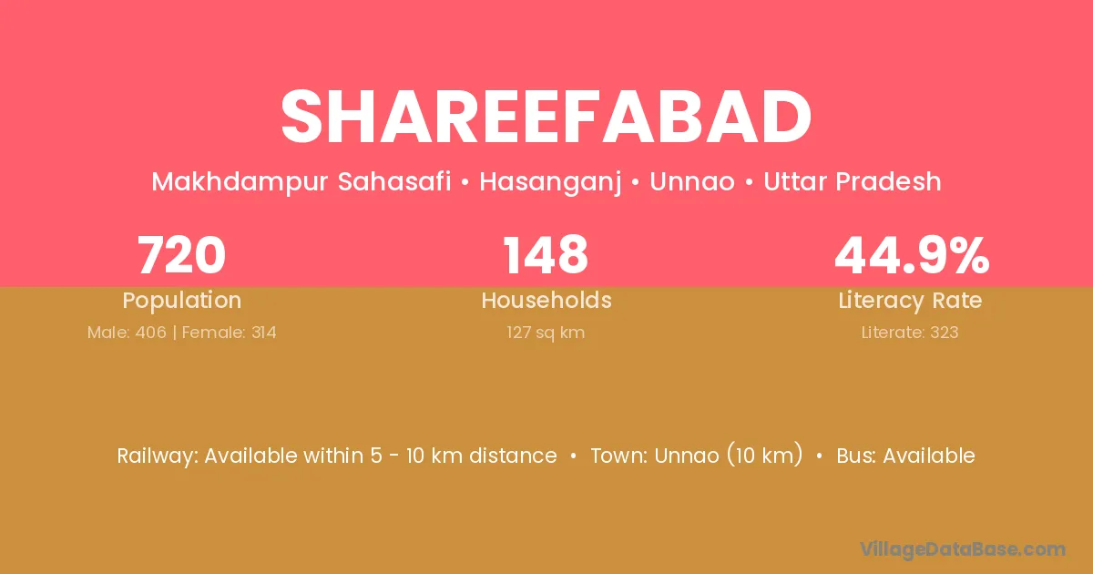 Unnao (10 km) is the nearest town to Shareefabad village for major economic activities and is located approximately 10 km away.