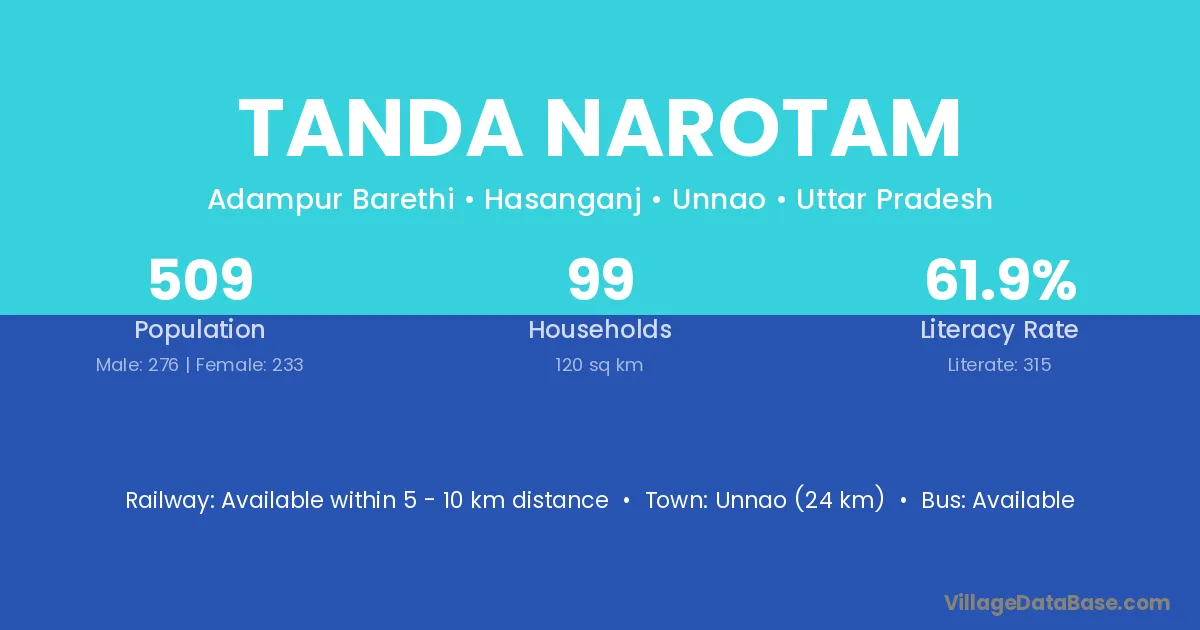 Unnao (24 km) is the nearest town to Tanda Narotam village for major economic activities and is located approximately 24 km away.