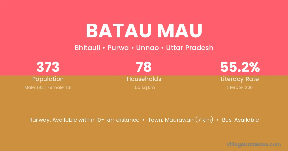 Maurawan (7 km) is the nearest town to Batau Mau village for major economic activities and is located approximately 7 km away.