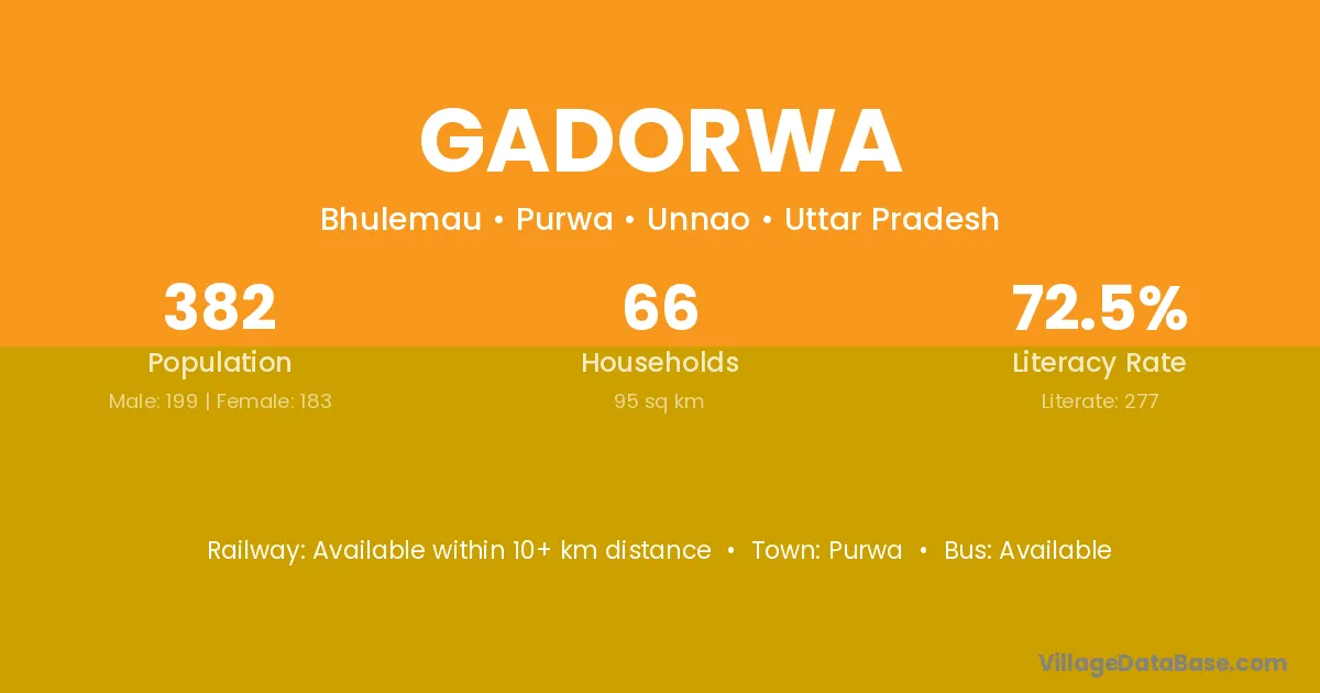 Gadorwa village has a total population of 382 people, of which 199 are males and 183 are females.