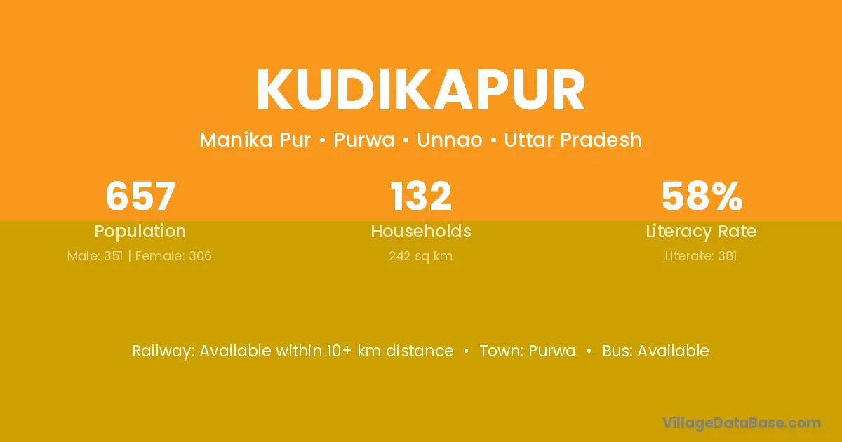 Kudikapur village has a total population of 657 people, of which 351 are males and 306 are females.