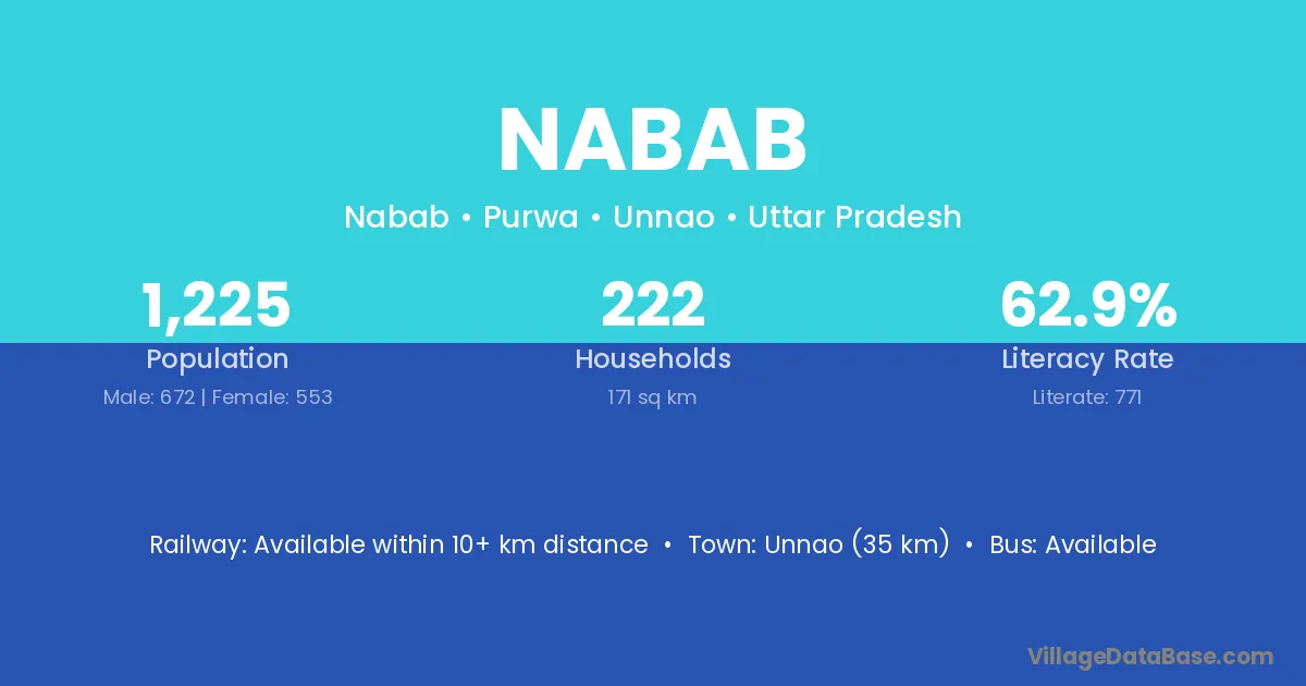 Unnao (35 km) is the nearest town to Nabab village for major economic activities and is located approximately 35 km away.