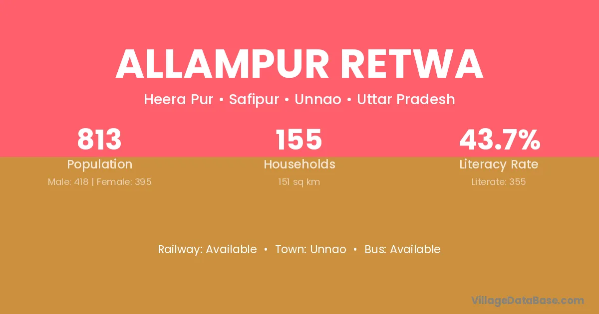 Allampur Retwa village has a total population of 813 people, of which 418 are males and 395 are females.