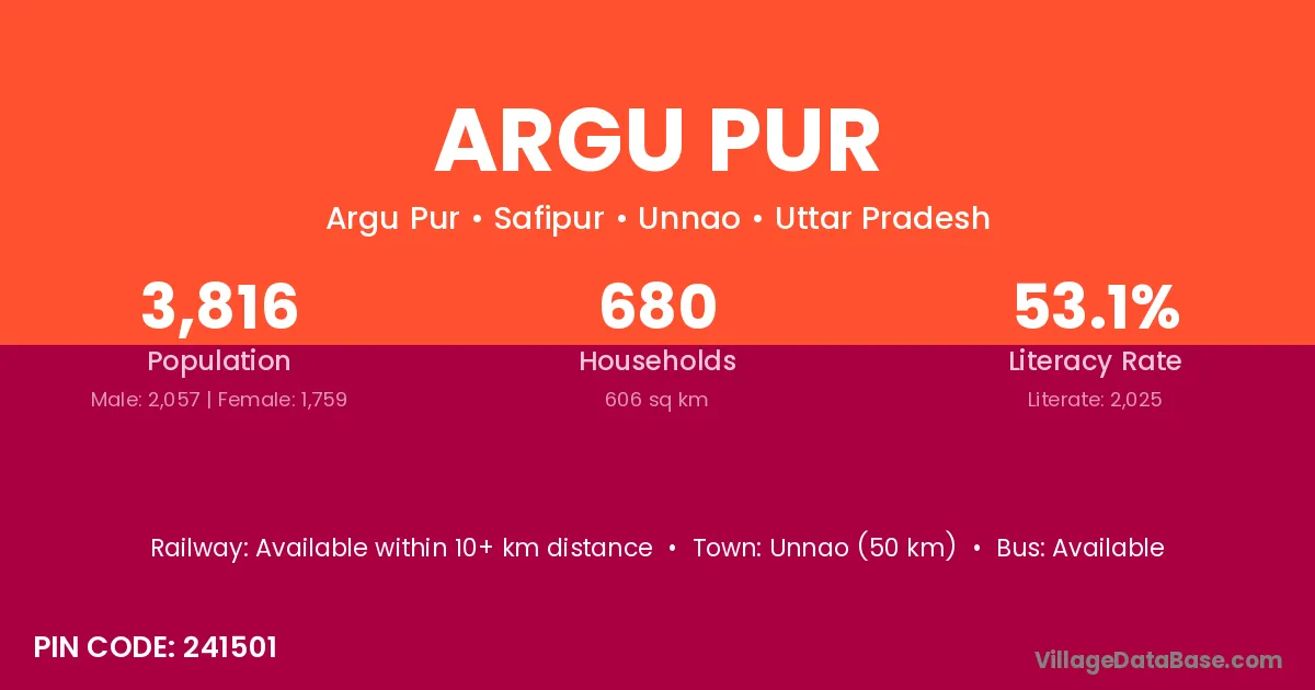 Unnao (50 km) is the nearest town to Argu Pur village for major economic activities and is located approximately 50 km away.
