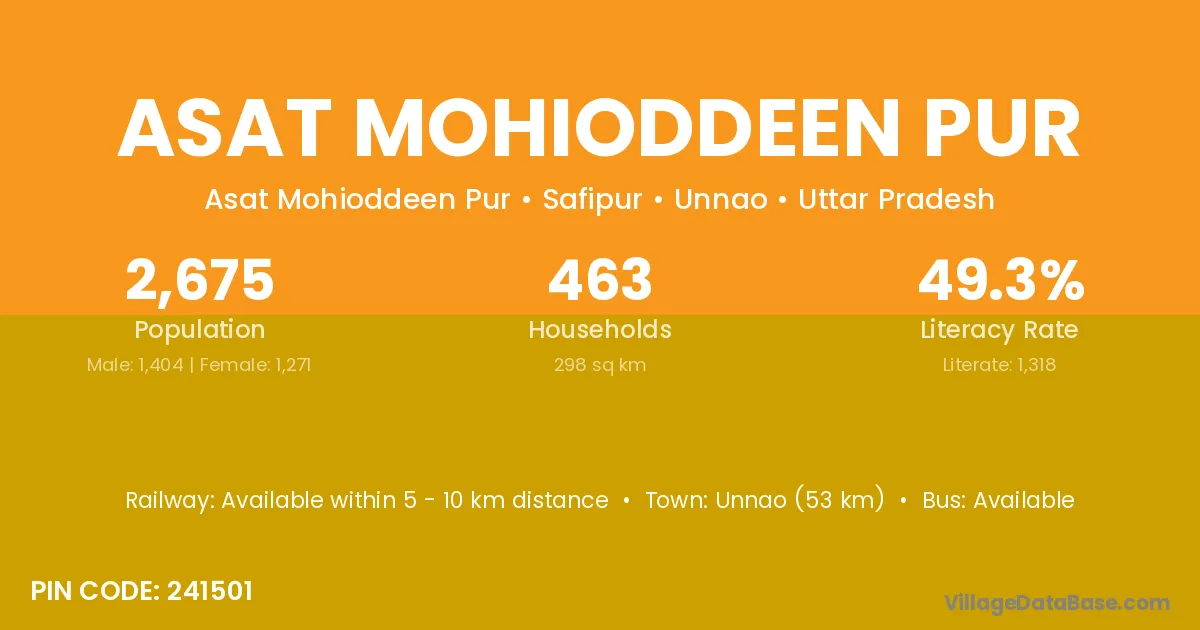 Unnao (53 km) is the nearest town to Asat Mohioddeen Pur village for major economic activities and is located approximately 53 km away.