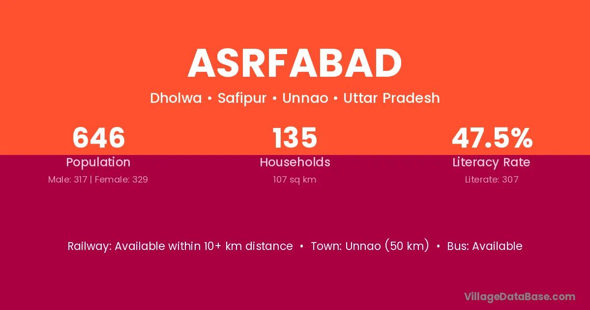 Unnao (50 km) is the nearest town to Asrfabad village for major economic activities and is located approximately 50 km away.
