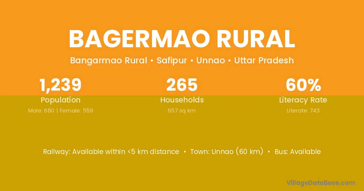 Unnao (60 km) is the nearest town to Bagermao Rural village for major economic activities and is located approximately 60 km away.