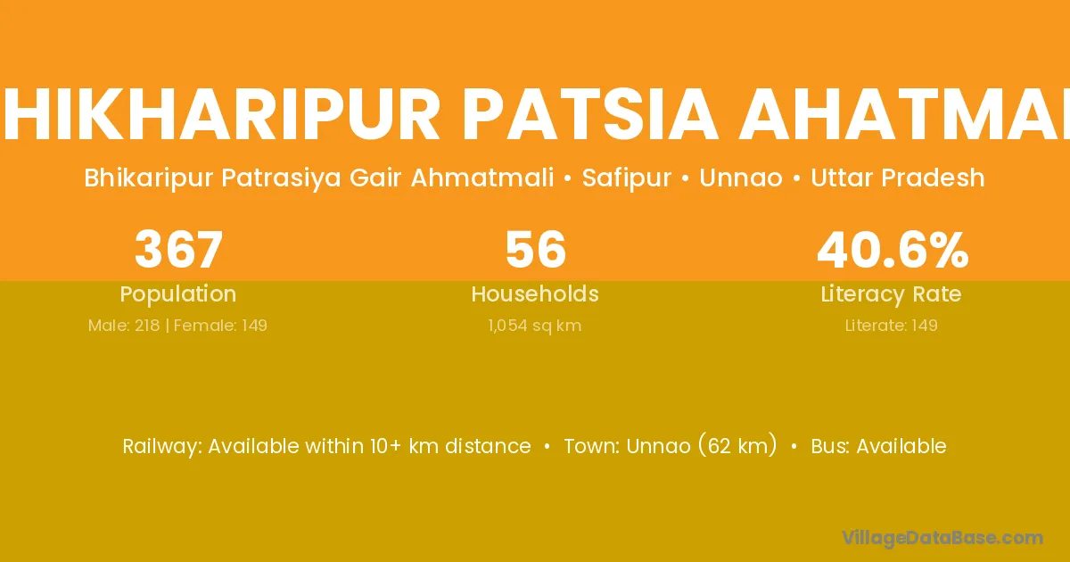 Unnao (62 km) is the nearest town to Bhikharipur Patsia Ahatmali village for major economic activities and is located approximately 62 km away.