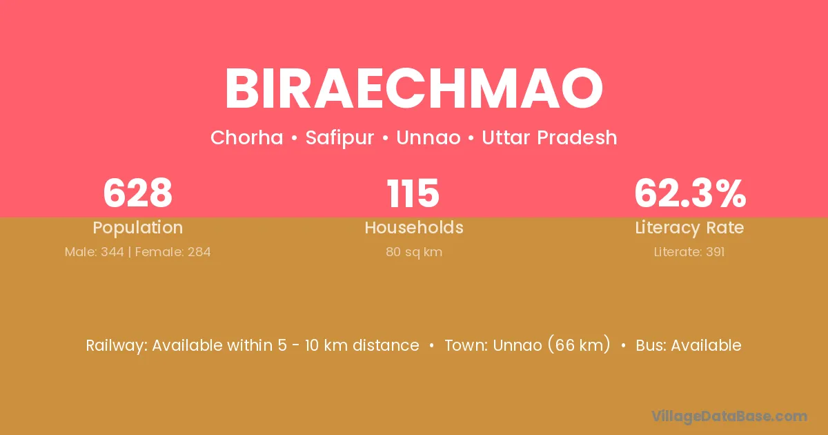 Unnao (66 km) is the nearest town to Biraechmao village for major economic activities and is located approximately 66 km away.